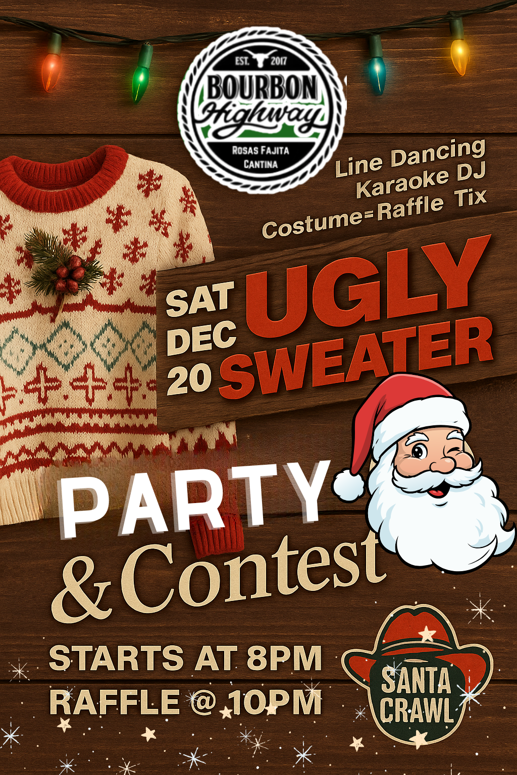 Join us for an Ugly Sweater Contest and Raffle! Event starts at 8 PM and Raffle starts at 10 PM.